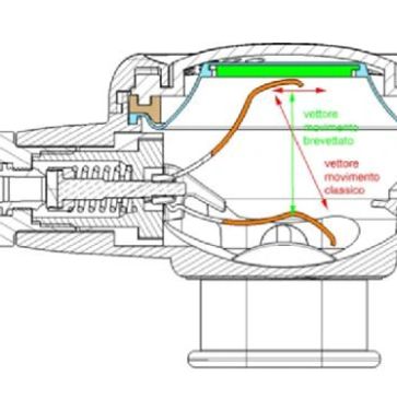 Basculación de la leva patentada. Una de los principales motivos del esfuerzo inspiratorio inicial es el rozamiento entre la leva y la membrana, XS Compact incopora una nueva patente Cressi que reduce el coeficiente de rozamiento de 0,2 a 0,001.
