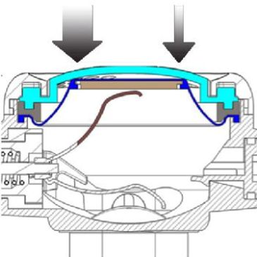 Esfuerzo de exhalación particularmente reducido sin necesidad de reducir el espesor de la membrana. El diseño del sistema de retención de la membrana dirige el flujo 100% encauzado hacia las toberas de la bigotera beneficiándose de un potente efecto Venturi que, además, colabora a dirigir las burbujas lejos del campo visual del buceador. Membrana embutida para evitar filtraciones de agua en caso de giros bruscos o al saltar desde la embarcación al agua.